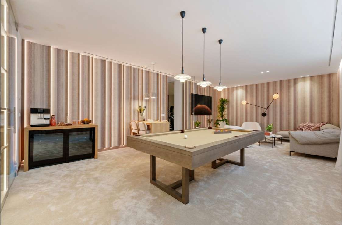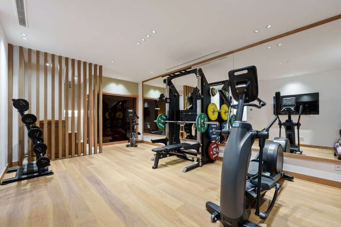 The property also includes four well-designed guest bedrooms, three bathrooms, and one half bathroom, an entertainment room with a bar and TV lounge, a private gym, and a wine cellar.