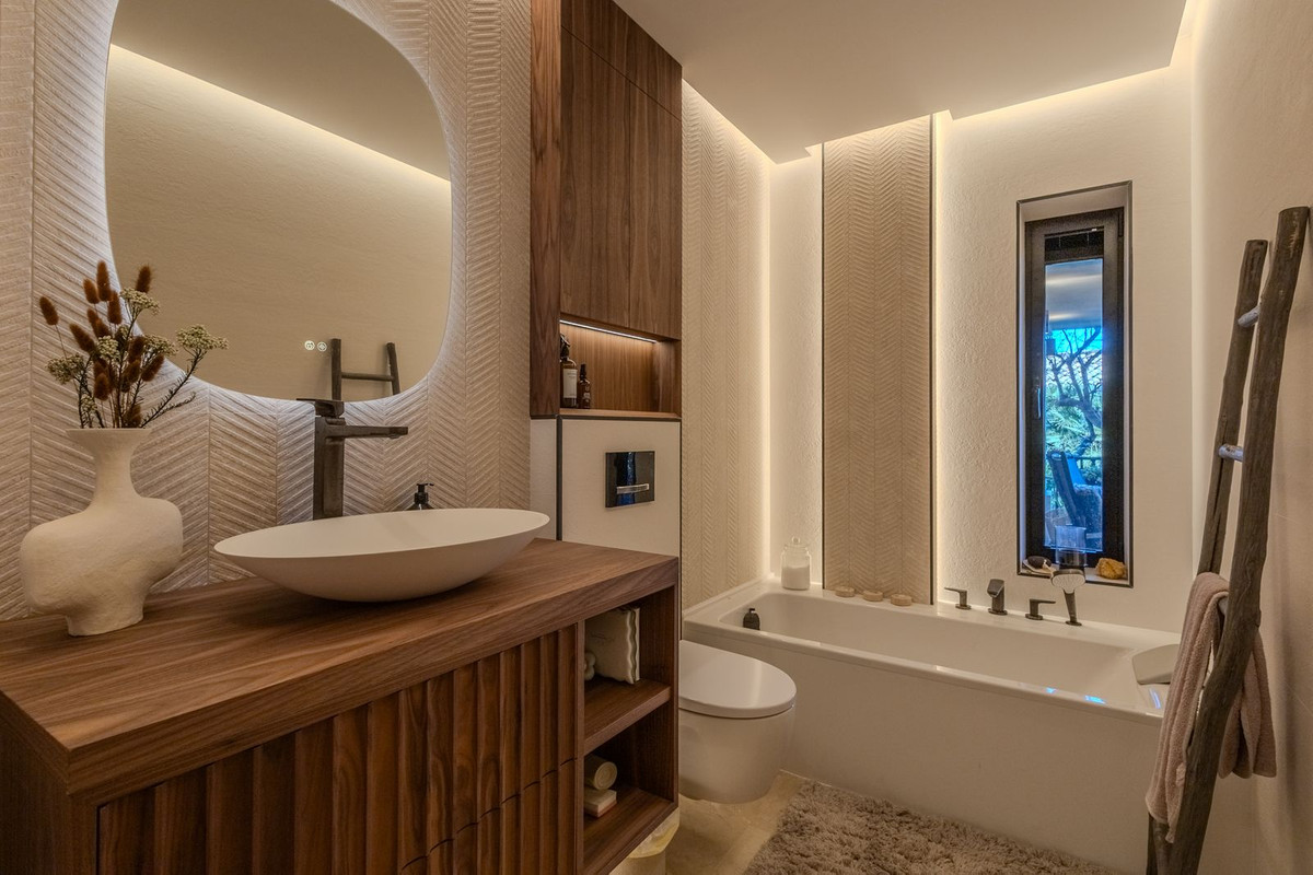 Elegant View Residence in La Cerquilla, Nueva Andalucía Located in the prestigious and secure gated community of Aldea Dorada, this semi-detached residence offers the ease of a townhouse with the elevated presence of a penthouse, set in one of Nueva Andalucía’s most exclusive and tranquil locations. From its privileged position, the property enjoys exceptional panoramic views across the Mediterranean Sea, the Golf Valley, and the iconic La Concha Mountain—widely considered among the finest views in Nueva Andalucía and the defining feature of the home. Behind a classic Andalusian façade, the interior reveals a warm and refined Japandi-style renovation, featuring high ceilings, open-plan living spaces, and modern bathrooms that create a calm and elegant atmosphere. The entrance level offers an open living and dining area with a striking suspended fireplace, a discreet office space, and direct access to a partly covered terrace designed to fully embrace the views. The home offers 300 m² built, 76 m² of terraces, and a 300 m² private garden with avocado, mango, and passion fruit trees. A plunge pool on the upper terrace delivers a true penthouse-style outdoor experience. The property comprises four bedrooms and three bathrooms, with excellent potential to create a luxurious master suite with walk-in wardrobe and en-suite bathroom. Additional features include a private gym, two large storage rooms, covered parking for two cars, and lower-level terraces with direct access to the garden. A rare opportunity for buyers seeking a secure, semi-detached luxury home with breathtaking views and effortless maintenance.