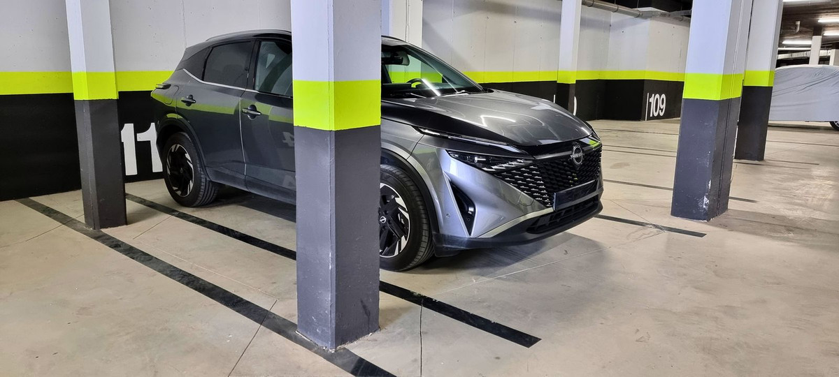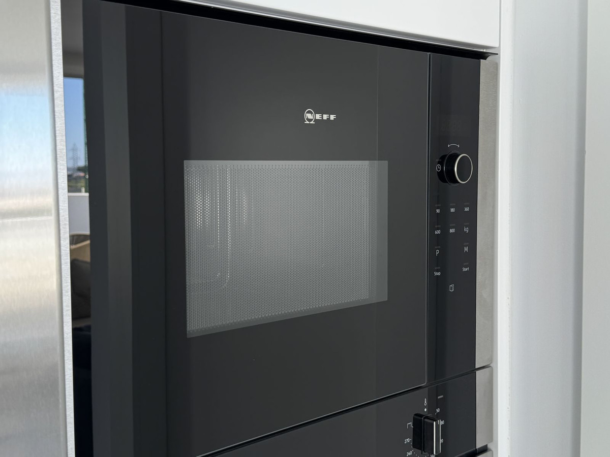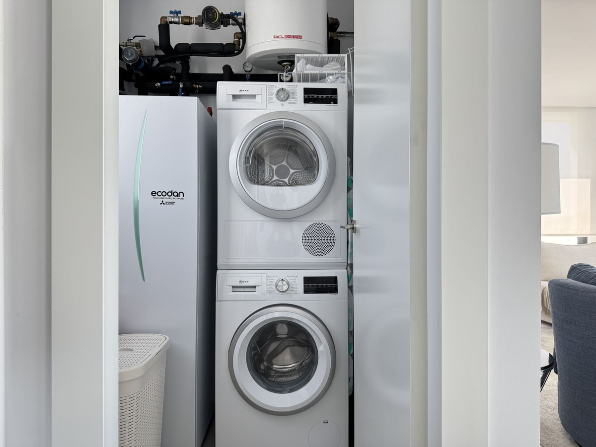 The home can be accessed from the building's stairs and also via elevator from the garage, thanks to a door that opens directly into the spacious living-dining room with an open kitchen fully equipped with high-end Neff appliances. Next to the kitchen is the laundry room with a washing machine, dryer, and aerothermal heat pump.
