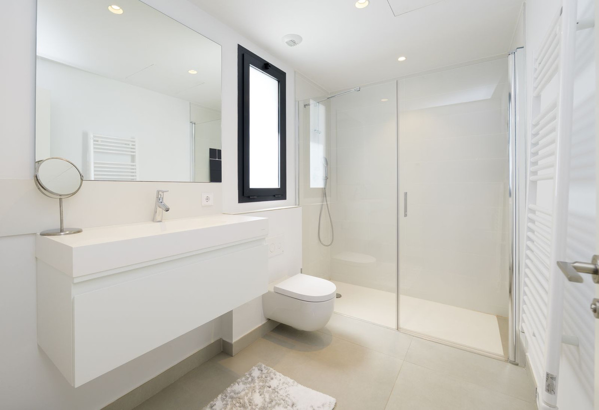In the hallway leading to the sleeping area, we find a guest toilet, a full bathroom with a shower, two guest bedrooms with built-in wardrobes, and the master bedroom with a comfortable dressing room and a full ensuite bathroom with a bathtub and shower.