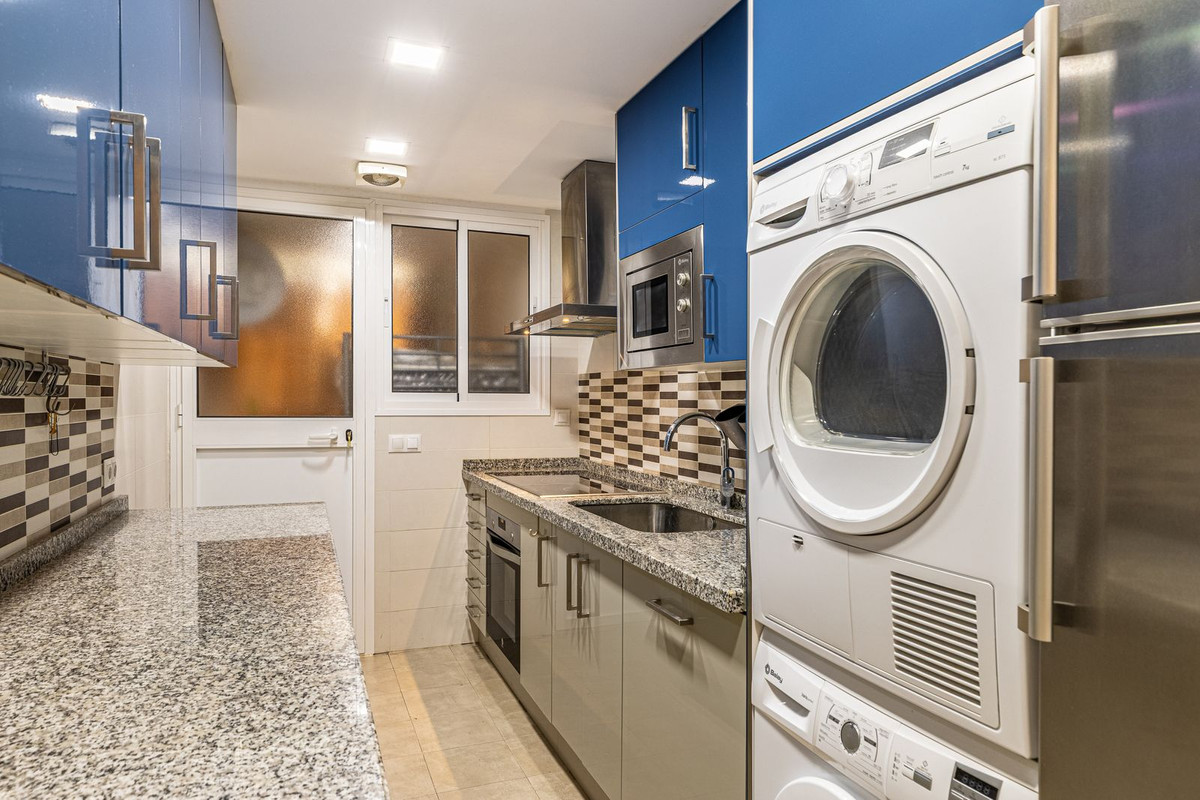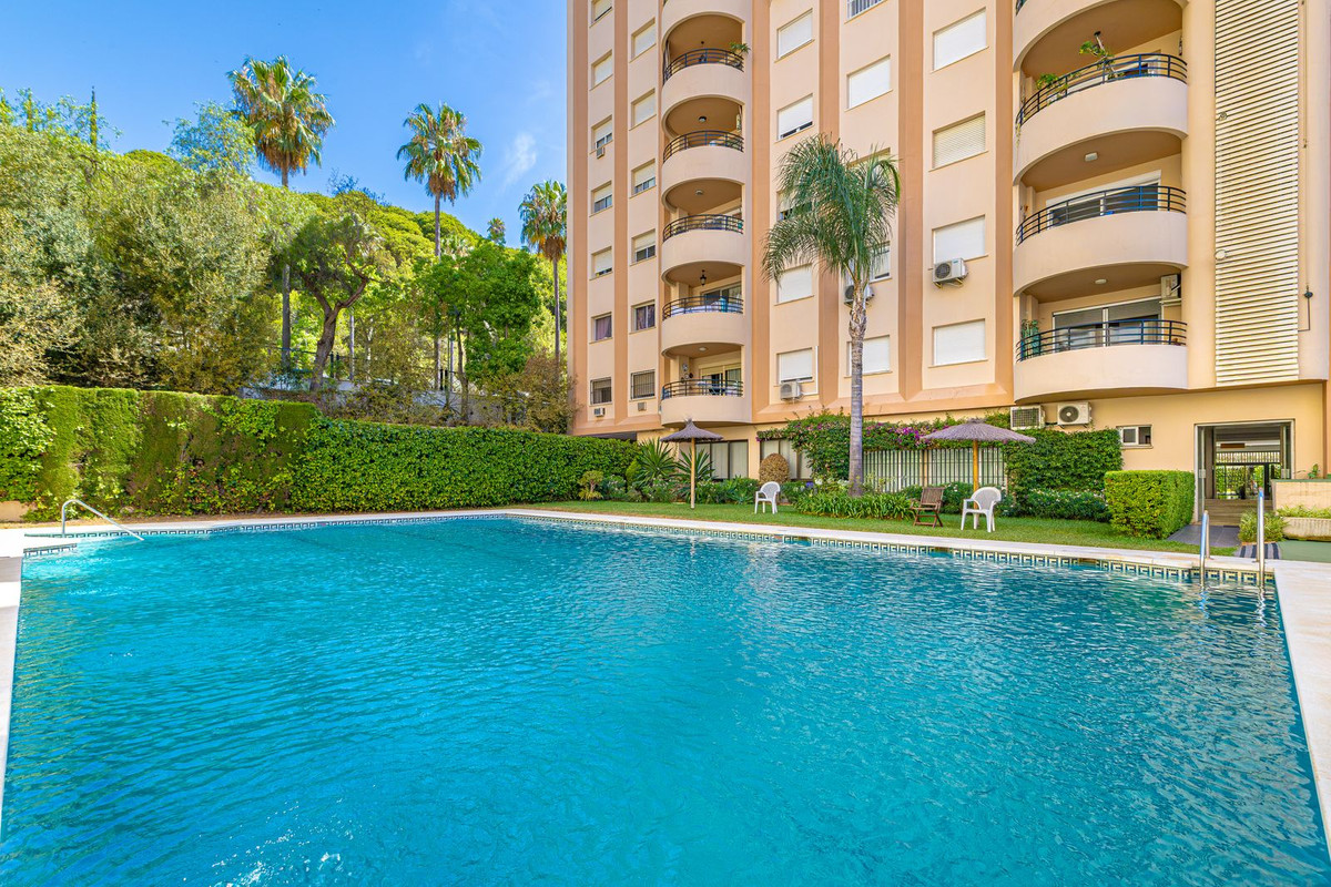 Impeccable corner apartment on the fifth floor with views of the pool and morning sun. The property has been completely renovated and is ready to move into. It has a living-dining room with access to the terrace, a fully equipped kitchen with a laundry room, a master bedroom with an en-suite bathroom and built-in wardrobes, and two further bedrooms, each with its own bathroom. Being on the corner, the property enjoys plenty of natural light. The car park is communal and enclosed with a gate. The building has a communal garden and swimming pool. Located in the heart of the city, just a stone's throw from Marbella's promenade and the beach.