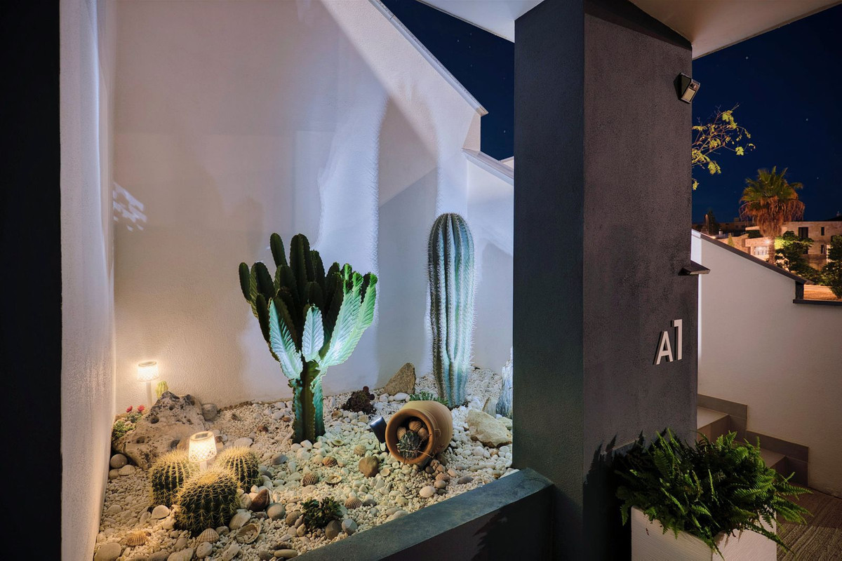 Every floor offers stunning sea views. The beach is just under a kilometer away via a nearly flat and relaxed walk. Within a few hundred meters, you will find grocery stores, a health center, charming cafés, and fine dining in La Cala de Mijas. Golf lovers will appreciate that La Noria Golf Resort is only 700 meters away, along with several other popular courses nearby.