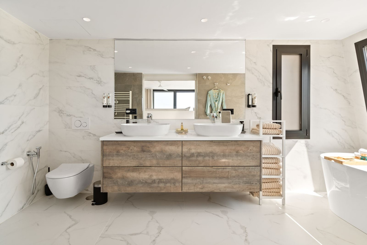 The upper floor is entirely dedicated to the master suite – a sublime private sanctuary where luxury meets serenity. From the bed, enjoy uninterrupted views of the mountains and the sea. The suite includes a spacious walk-in wardrobe, a cozy lounge corner, and an elegant bathroom with a view of La Concha that makes every morning feel magical – a daily reminder of the extraordinary life this villa offers.