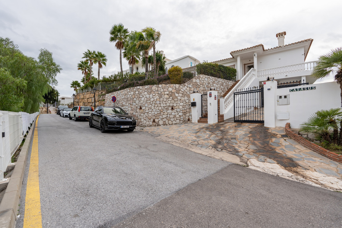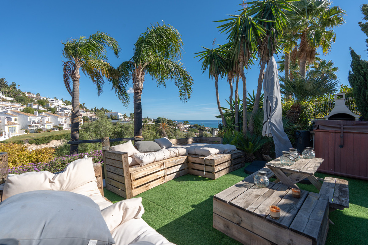 This homely family villa boasts a fantastic location in the most popular area of Benalmádena bordering the famous Higuerón resorts. Sitting in an elevated position with great views of the surrounding mountains and partial sea views. The ground floor hosts the bright salon with semi open kitchen, 3 bedrooms, 2 bathrooms and laundry room conveniently all on one level. The salon and two of the bedrooms open to the covered porch and sunny Southwest facing pool deck. Various cozy terraces and lounge areas wrap around the house. The lower floor contains of the fourth bedroom ensuite ideal for hosting guests and a spacious garage. Very private and quiet area thanks to the cul-de-sac street which offers lots of parking space right in front of the house as well. Well worth a visit and we will be happy to show you the full potential of this villa. This property comes to market for the first time in 25 years, so you now have the chance to benefit from this rare opportunity. Close to the sea, close to amenities. Come and see it with your own eyes please!
