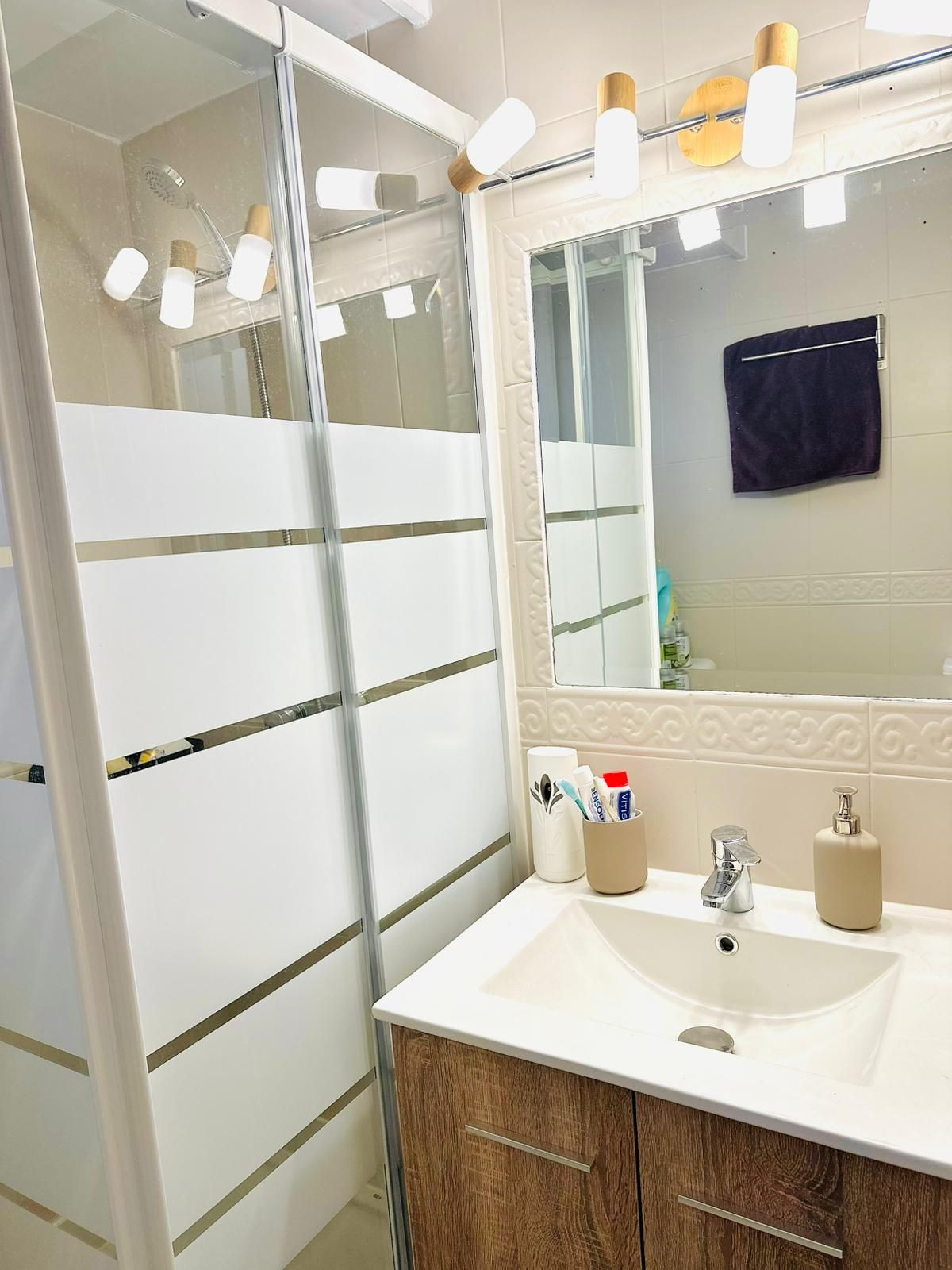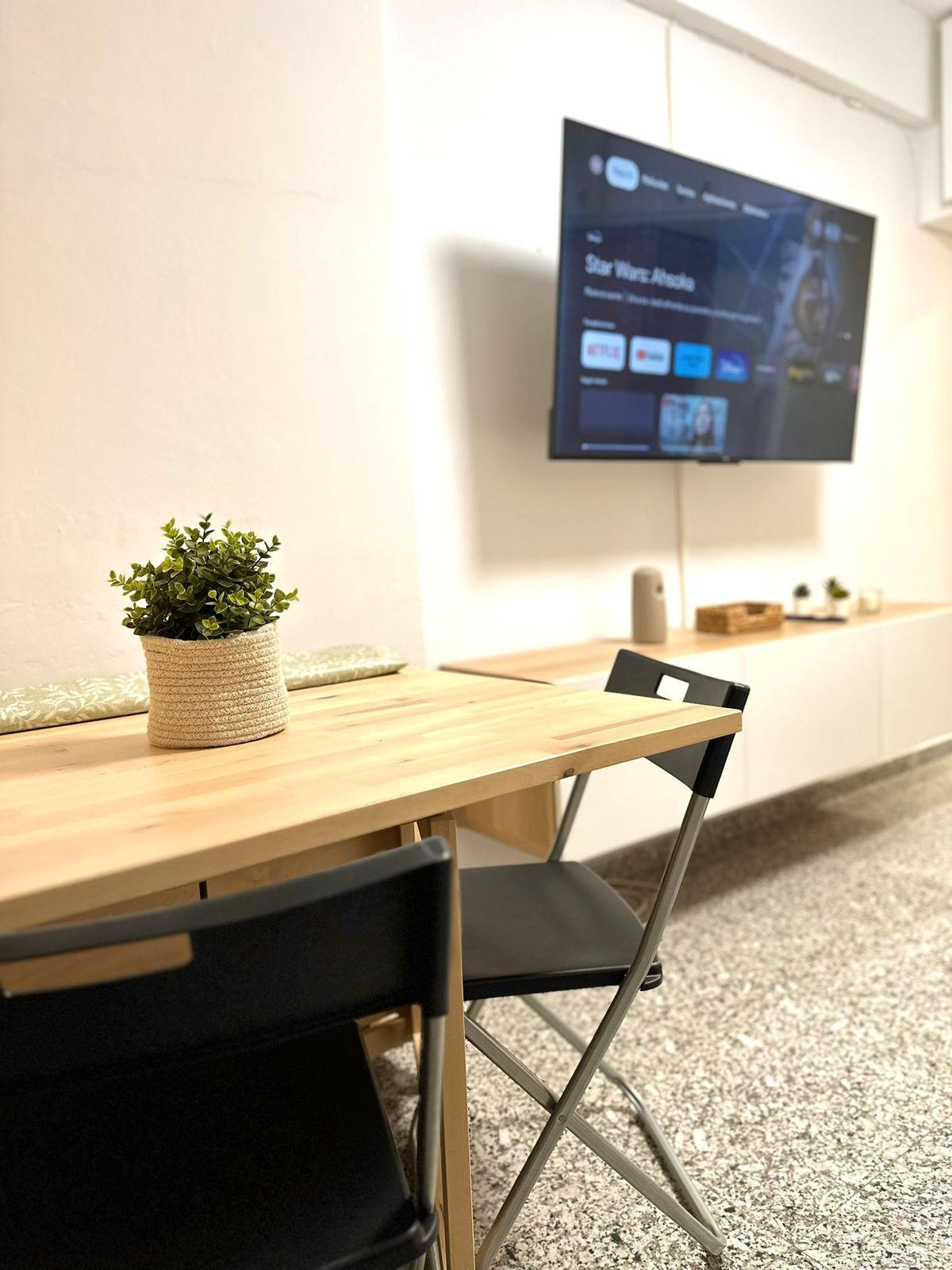 The interior comprises a bright living/bedroom area opening directly onto the terrace, as well as a fully equipped kitchen and a renovated bathroom that combines functionality with contemporary aesthetics.