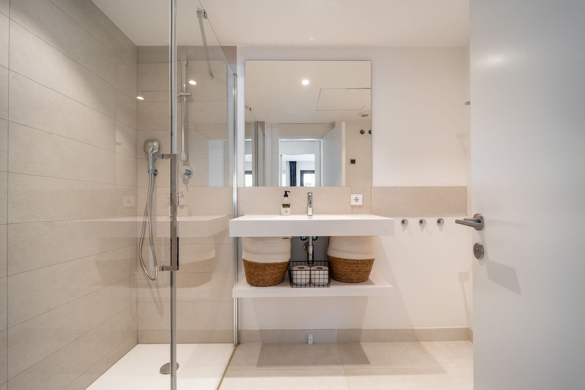 Stunning west facing corner garden apartment, with 3 bedrooms, and 2 bathrooms, spacious living-dining room, open plan kitchen fully furnished and equipped with electricial appliances from Bosch, including MIELE fridge/freezer, laundry area with washing machine/dryer, large wrap around terrace of 78m2 with access from living area and main bedroom. There is also a backside terrace of 34m2 with access from the secondary bedrooms. Spacious private garden area of 258m2. Main bedroom with ensuite bathroom and walk-in wardrobe. Air conditioning hot and cold, built-in wardrobes in secondary bedrooms and hall entrance, video intercom, domotic system, pre-installation alarm system, water purification system in kitchen, under floor heating throughout all the apartment including bathrooms. Includes two parking spaces (one parking with electric car charger) and one storage room.