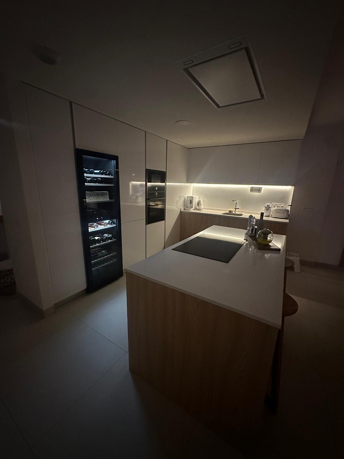 The apartment includes two underground parking spaces and a private storage room. High-end finishes and features include underfloor heating throughout, a guest bathroom, a laundry room, and a contemporary open-plan living space with a sleek kitchen island, leading onto a large terrace ideal for entertaining.