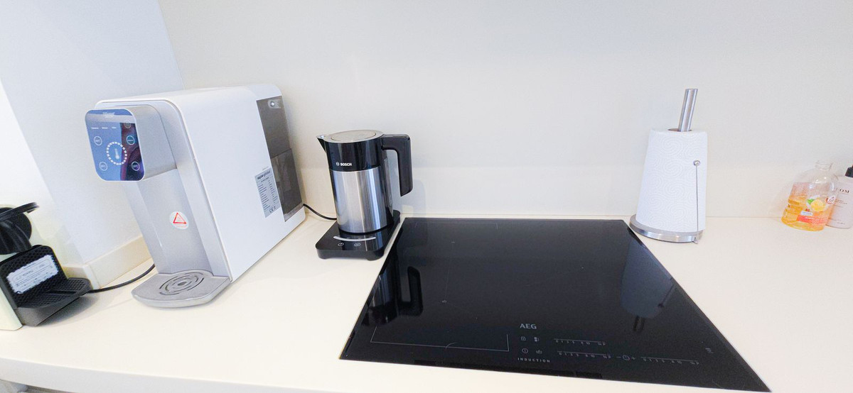Premium Kitchen:Sleek resin worktops, high-end appliances.