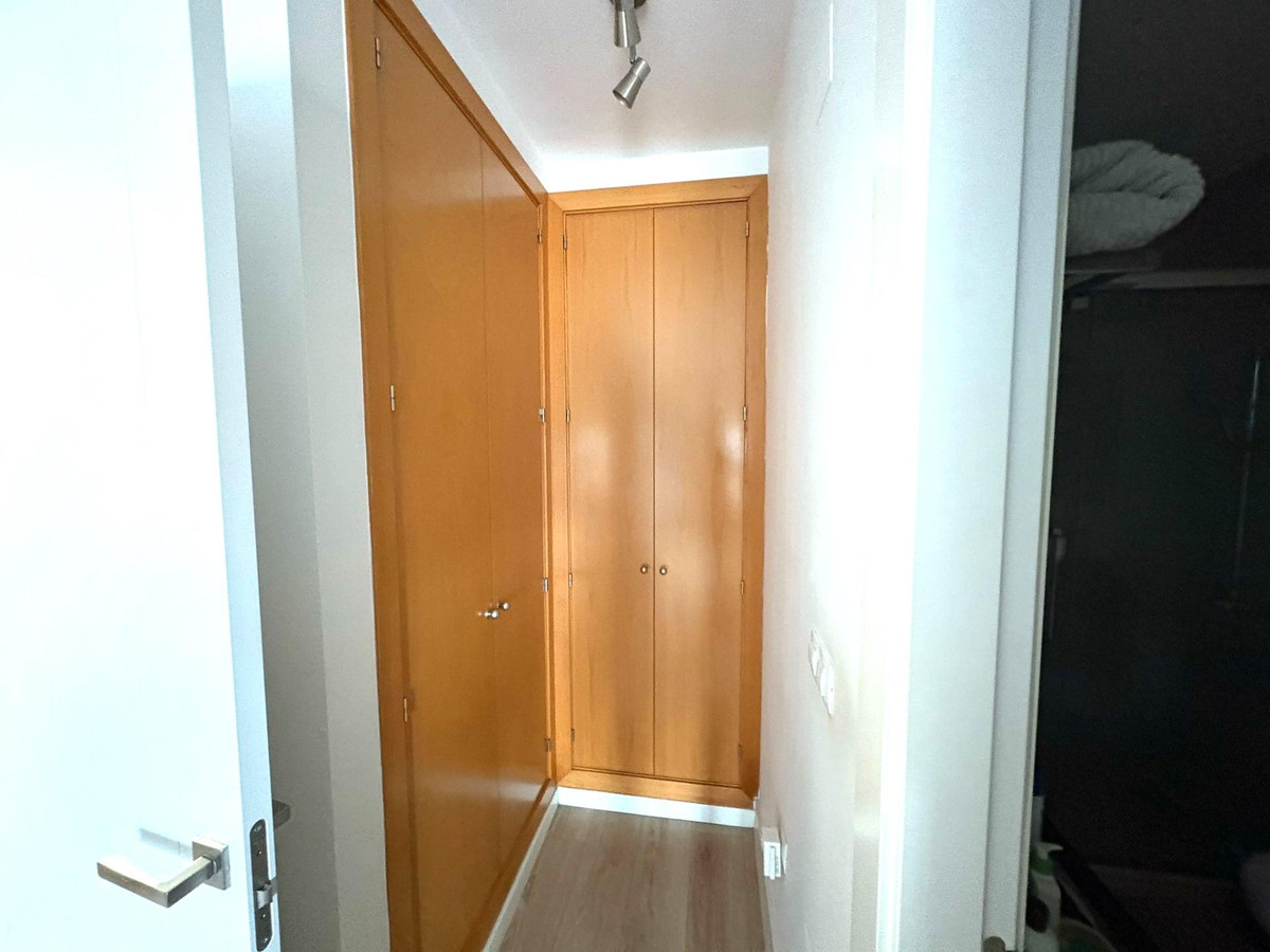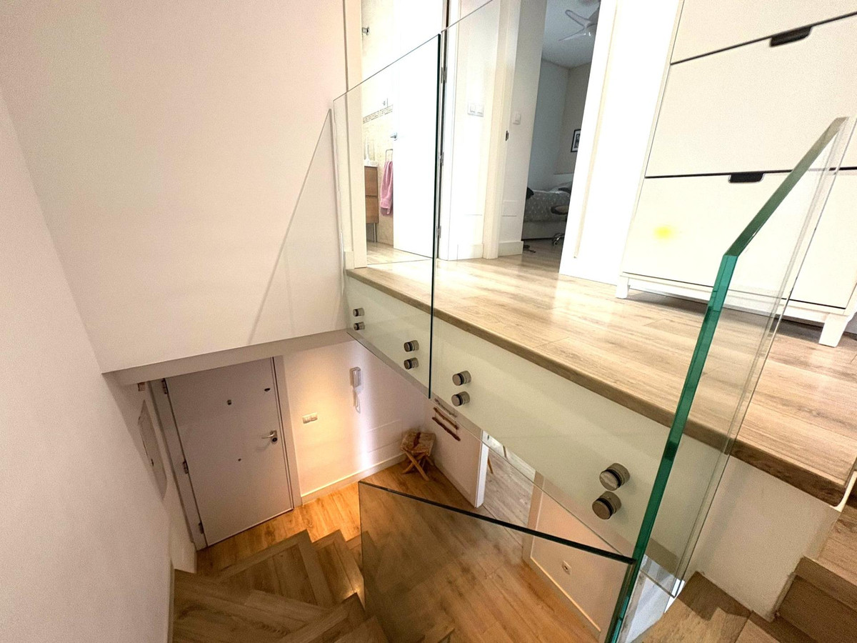 Upon entering, you’re welcomed by a spacious and bright foyer featuring a modern staircase with a tempered glass railing, adding a contemporary touch to the home. The main floor offers a functional layout with a fully equipped kitchen, separate laundry room, a full bathroom, one bedroom, and a spacious living-dining area with direct access to a generous terrace. From here, you can enjoy breathtaking open views of the Bay of Málaga — a true daily luxury.